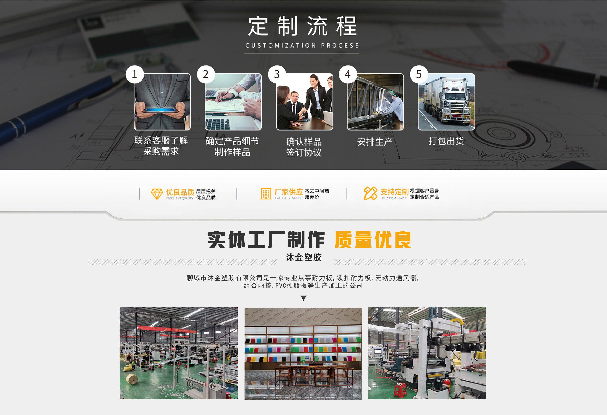 聊城市沐金塑膠有限公司注冊資金2180萬元,占地20000余平方,擁有自建廠房15000平方,員工100余名。10余年來,公司主營耐力板,鎖扣耐力板,耐力板深加工,無動力通風器,組合雨搭,PVC硬脂板,耐力板廠家等板材的發(fā)展戰(zhàn)略,逐漸成長為綜合性企業(yè)。 公司擁有多條板材共擠生產(chǎn)線,采用世界知名品牌進口原材料和先進工藝,依據(jù)完善的ISO9001質(zhì)量管理體系和ISO14001環(huán)境管理體系,為產(chǎn)品的卓越品質(zhì)提供了強有力的保證。憑借過硬的創(chuàng)新能力和堅實的硬件基礎(chǔ),贏創(chuàng)已成為國內(nèi)領(lǐng)先的熱塑性板材生產(chǎn)商,產(chǎn)品被廣泛應用于建筑業(yè)、農(nóng)業(yè)、工業(yè)、廣告業(yè)、安防行業(yè)及DIY領(lǐng)域?! 」臼冀K致力于通過提供最優(yōu)的板材應用解決方案,為客戶創(chuàng)造最高的價值;堅守創(chuàng)新、質(zhì)量、靈活、服務和速度的核心價值觀;堅持“完美的產(chǎn)品需要完美服務的支持”的經(jīng)營理念,努力實現(xiàn)成為世界領(lǐng)先的板材與解決方案供應商的夢想?! ≡谖磥恚緦⒘⒆憧蛻粜枨?,不斷改變和完善現(xiàn)有產(chǎn)品,拓展產(chǎn)品線和充分開發(fā)板材的應用領(lǐng)域,為客戶創(chuàng)造全方位的價值。同時更好地實現(xiàn)員工的價值,實現(xiàn)公司團隊的價值。我們將與您一起創(chuàng)贏未來! 企業(yè)使命:成為世界領(lǐng)先的板材與解決方案供應商?! 」驹妇埃和ㄟ^提供最優(yōu)的板材應用解決方案,為客戶創(chuàng)造最高的價值。 核心價值觀:質(zhì)量...